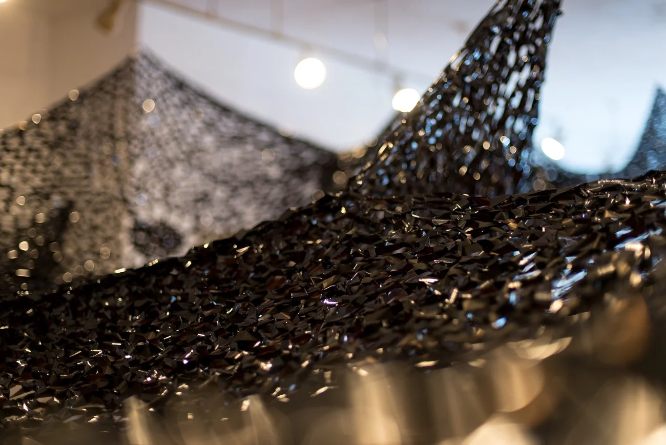 Light and texture is a huge inspiration for me. Photos sometimes don't do enough justice to the experience of seeing the VHS in person. It's reflections shimmer in the crochet texture, and is constantly changing as you walk around the piece. I love the selective focus used on the photo above because it captures the glimpses of light you experience in person.